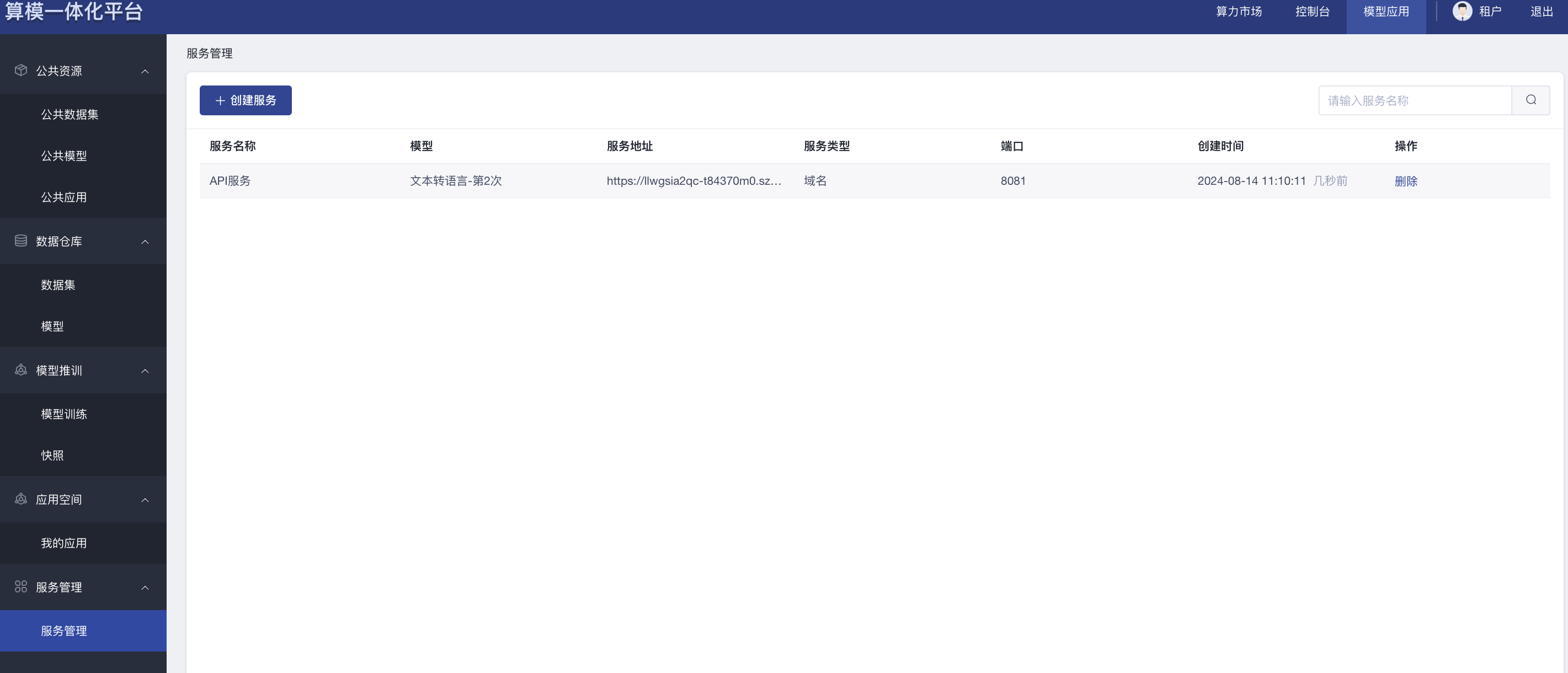 点击创建服务、选择模型和服务类型、输入端口即可创建成功对外提供的API接口服务