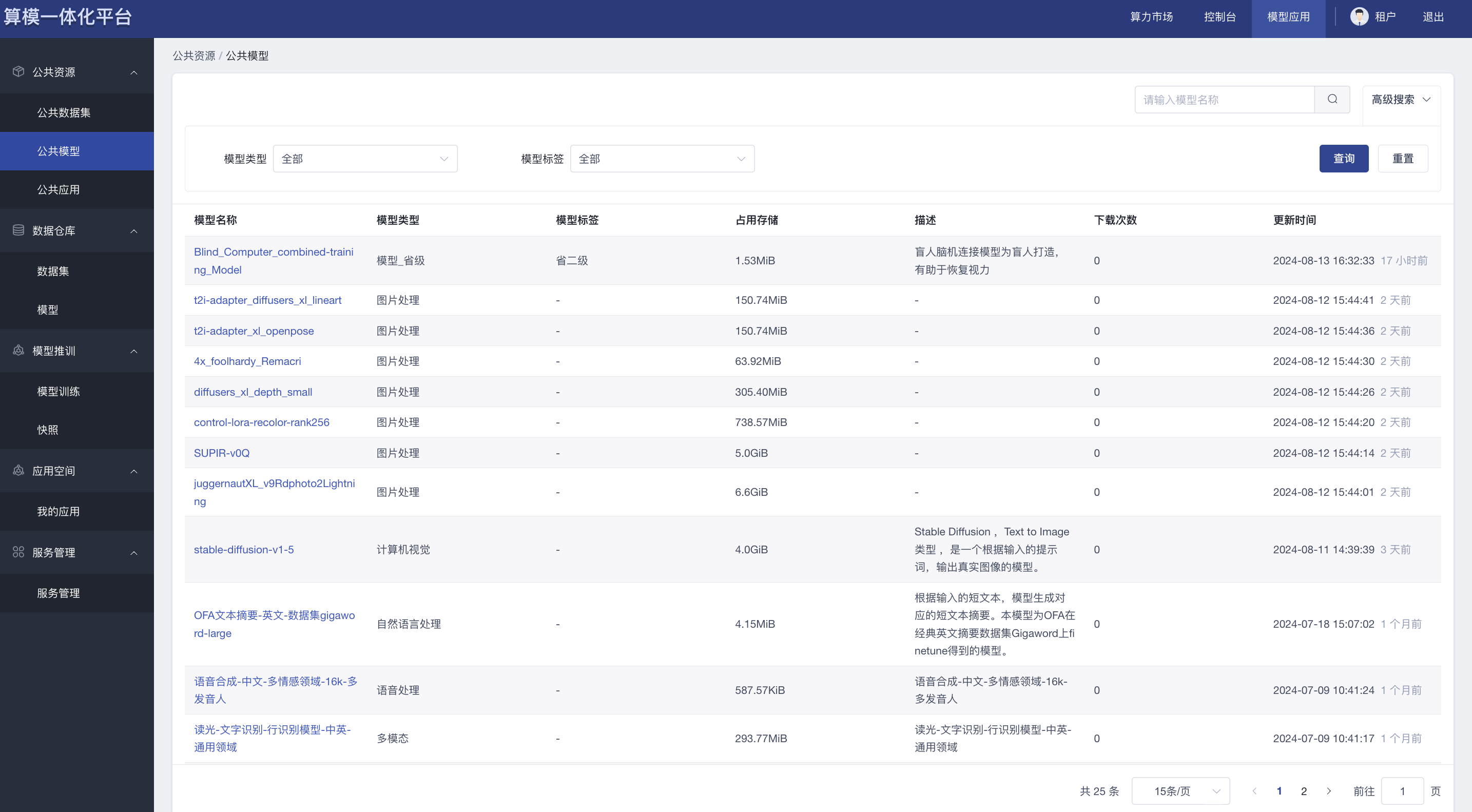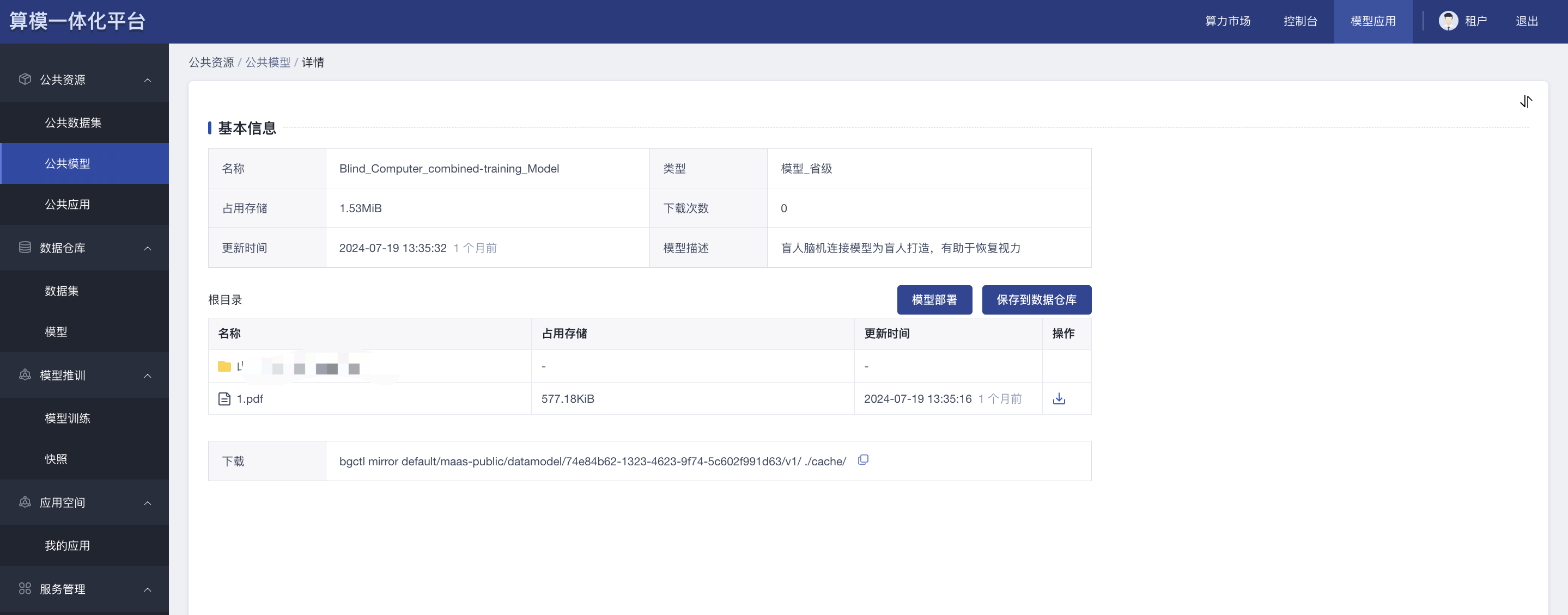 登录租户账号,点击【公共资源-公共模型】进入页面,该数据可于【模型推训-模型训练】中使用。点击模型名称,可下载、部署、保存模型到数据仓库