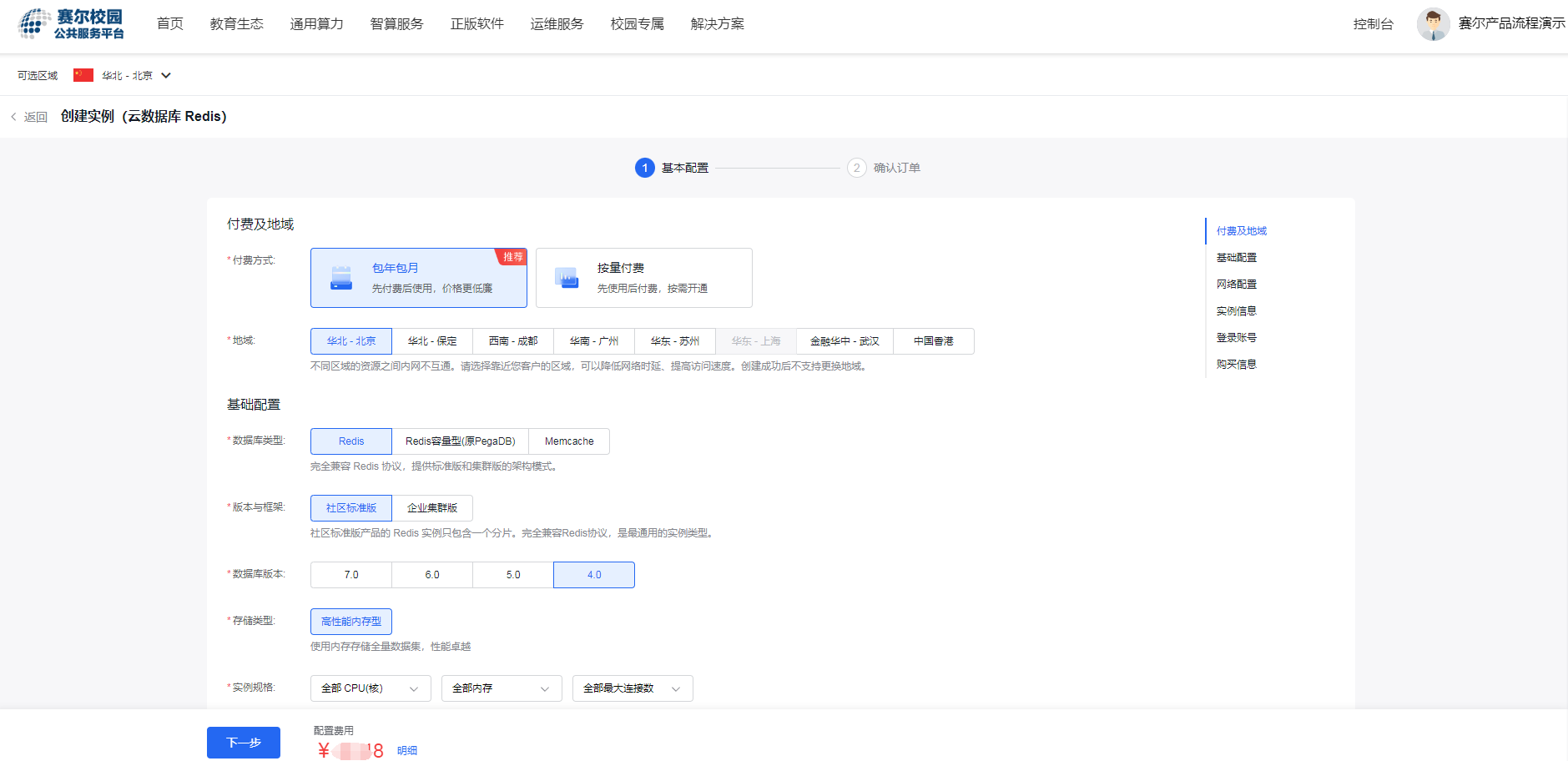 不同的计费模式(按量付费、包年包月),如选择的是包年包月模式,购买页面会展示订单总金额;如选择的是按量付费模式,则显示每小时单价。