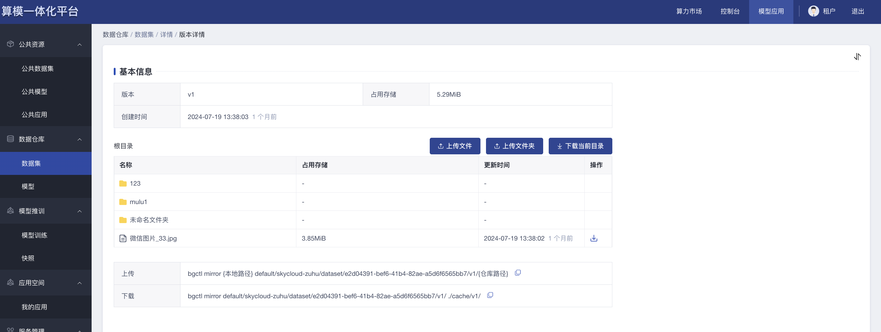 登录租户账号,点击【公共资源-公共模型】进入页面,该数据可于【模型推训-模型训练】中使用。点击模型名称,可下载、部署、保存模型到数据仓库