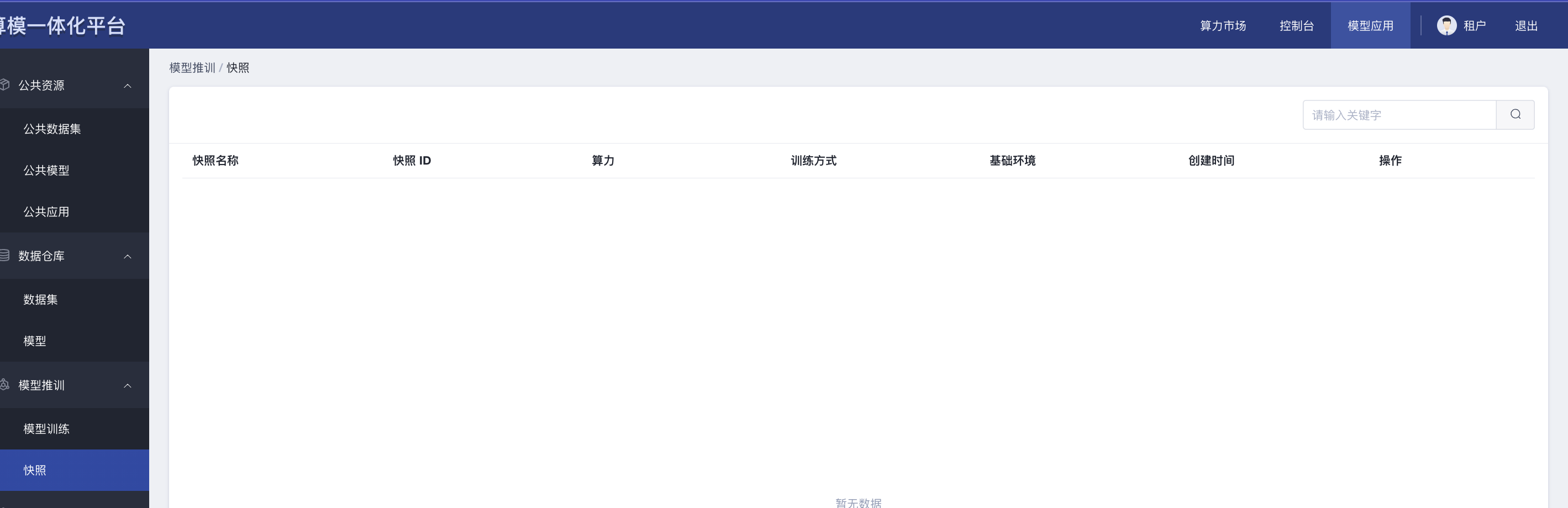 登录租户账号,点击【模型推训-快照】进入页面,可对快照进行开始训练和查看详情